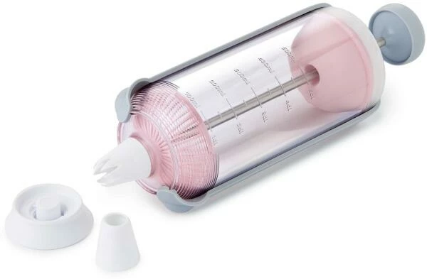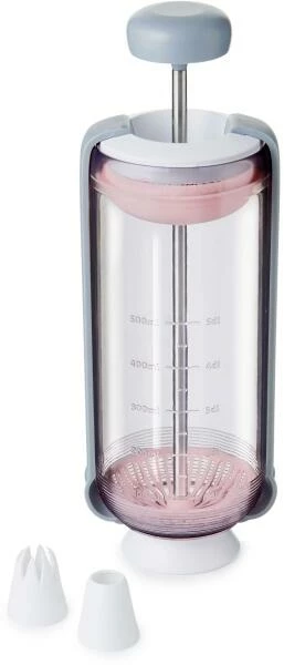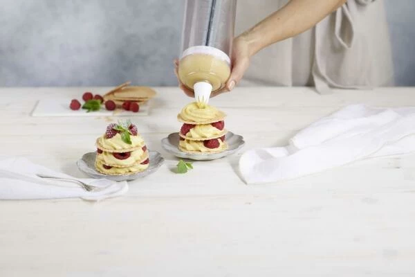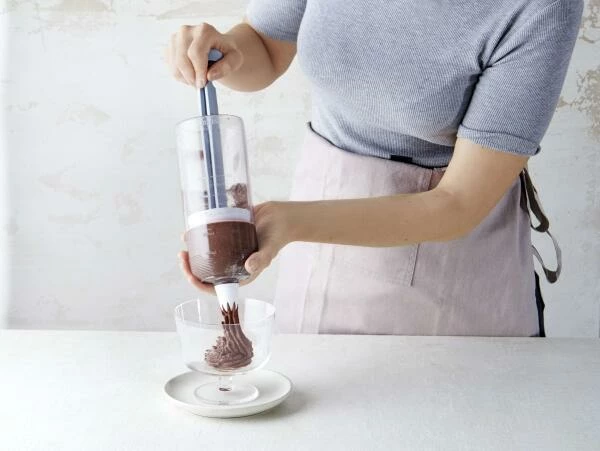 Betty Bossi Dekorierset Dessert-Blitz. Mit diesem Gerät können Sie Desserts und Cremes bequem herstellen und direkt damit anrichten. Für bis zu 500 ml Füllmenge geeignet.