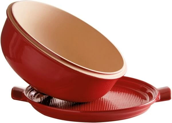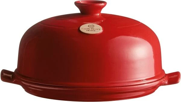 Emile Henry Brotbackform Set in granatapfel. Die runde Form der Brotbackhaube hat genau den gleichen Effekt wie die Wölbung traditioneller Brotbacköfen, damit das Brot beim Backen den richtigen Feuchtigkeitsgrad bekommt.