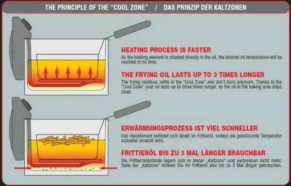 Alle Fritel Fritteusen verfügen über eine Kaltzone. Die Heizung hängt direkt im Frittieröl. Im Handumdrehen erreicht das Öl die richtige Temperatur. Die Fritierrückstände sinken in die Kaltzone und verbrennen nicht mehr. Das Frittieröl hält 3 Mal länger.