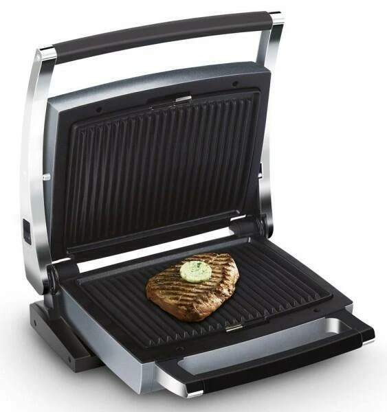 Dank der 180° Funktion des Kombi-Grills CW 2428 von Fritel eignet sich dieser multifunktionale, platzsparende Grill sowohl als Barbecue- oder Tafelgrill, um z.B. herrliche Panini zum Lunch, ein leckeres Stück Fisch oder ein köstliches Steak zuzubereiten. Aber auch für die Herstellung von Waffeln kann dieser Grill verwendet werden und ist somit ideal für ein gemütliches Zusammensein oder eine Feier geeignet. Für eine optimale Wärmeverteilung verfügt der Grill über Backplatten aus massivem Aluminium-Druckguss. Durch die höhere Wattstärke von 1.600 W und dem performantem Heat Shield ist eine noch genauere Temperaturregelung möglich. Dank der automatischen Anpassung der Backplatte an die Dicke der Lebensmittel, können sowohl dicke als auch dünne Stücke Fleisch oder Fisch zubereitet werden. Die Antihaftbeschichtung des Grills sorgt dafür, das keine Lebensmittel an die Backplatte ankleben. Durch die einzigartige Konstruktion der Grillplatte, läuft das Fett automatisch zu den Rändern ab.