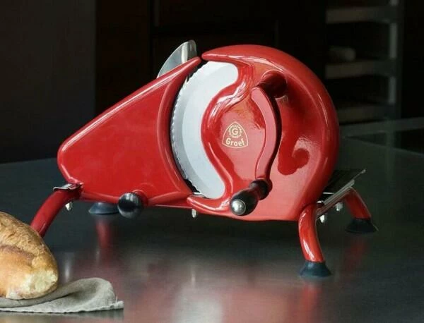 (Nicht nur) Nachtschwärmer können auch von der Manuale H 93 träumen. Der neu aufgelegte, hochwertige Handallesschneider aus den 60er Jahren glänzt durch seine Optik im retrostylischem Rot und beste Schneideeigenschaften per Muskelkraft. Ein 19 cm großes und komplett durchgehärtetes Wellenschliffmesser aus Edelstahl sowie Schlitten und Arbeitstisch aus Edelstahl und darüber hinaus die leichtgängige Kurbel mit Griff machen die Maschine zu einem schnittigen Hingucker. Sie schneidet ebenso spielend leicht durch Brot, Wurst und Käse wie ihre elektrischen “Geschwister”. Die vier Sauggummifüße verleihen der Maschine einen sicheren, festen Stand. Der abnehmbare Edelstahlschlitten ermöglicht eine einfache und schnelle Reinigung. Eine ideal Maschine die überall einsetzbar und extrem energiesparend ist.