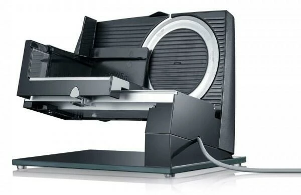 Durch das glatte Edelstahlmesser und die professionelle Schrägstellung werden Zutaten wie Brot, Wurst, Käse und Gemüse präzise in feine Scheiben geschnitten und auf der Glasbodenplatte aufgefangen. Der Durchzugsstarke 200 W Motor sorgt für höchste Laufruhe bei einer konstanten Drehzahl. Nach der Nutzung kann das Messer mit Safety-Verschluss schnell gewechselt werden und erhält dank des Diamantschärfers seine ursprüngliche Schärfe zurück.