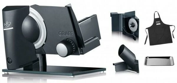 Hochwertige Schneidemaschine für das Schneiden von dünnen bis sehr dünnen Scheiben in der Johann Lafer Edition. Inklusive Mini-Slice-Aufsatz, Diamant-Messerschärfer D-1000, Edelstahltablett, Kochschürze und Rezeptheft. Made in Germany!