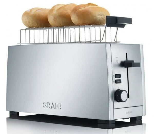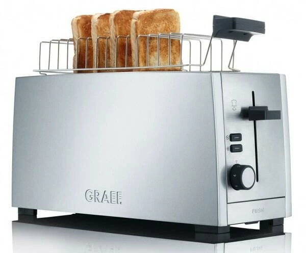 Graef 4 Scheiben Edelstahl Toaster TO 100 im klassischen Silber, bräunt Ihnen gleich vier Toasts auf einmal. Die langen Wartezeiten auf einen Toast, während die Familie bereits am Frühstückstisch sitzt, gehören der Vergangenheit an. Mit dem 4 Scheiben Edelstahl Toaster TO 100 verwöhnen Sie die ganze Familie mit knusprigen Toasts. Das Ziel – knusprige XXL-Toasts und bester Geschmack. Mmmmmh, riechen Sie schon den Duft von frisch geröstetem Toastbrot?