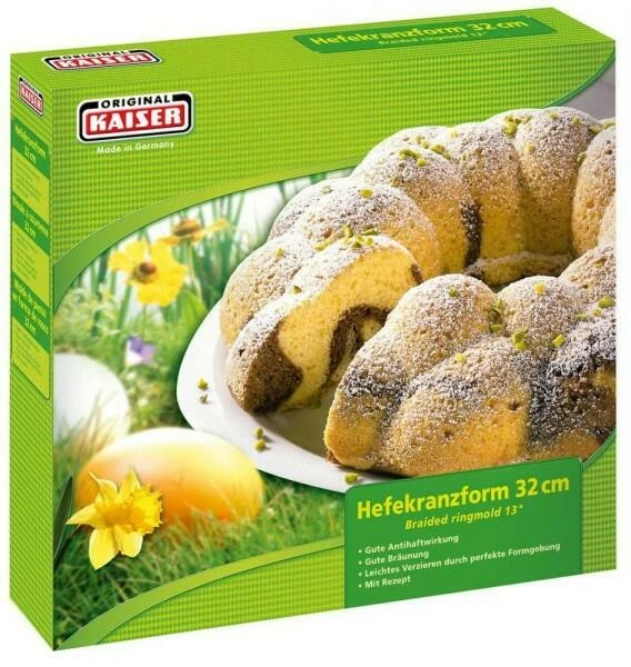 Kaisers Motivbackform Hefekranz kann ein eigener, traditioneller Osterkranz gebacken werden. Kunstvoll verziert erfreut er auf dem Kaffeetisch kleine und große Gäste.