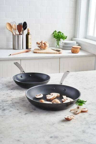 KitchenAid KitchenAid Antihaft-Bratpfanne aus harteloxiertem Aluminium im 2er-Set, bestehend aus zwei Pfannen mit 20 und 30 cm Durchmesser. Ideal zum Braten von allem, was leicht anhaftet und wenig Fett benötigt wie Fisch, Geflügel, Gemüse, Pfannkuchen, Crêpes oder Omelettes.
