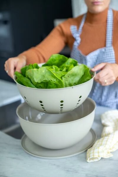 Skandinavisches Design für jeden Tag. Der puristischen Schüsselform liegt ein Kugelabschnitt zugrunde und damit sie nicht einfach wegrollt, hat der Boden eine Innenwölbung für absolutes Stehvermögen. Besonders praktisch ist die Rundum-Gießkante für Schütten ohne Kleckern. Die dazugehörigen Seiher PALSBY L und PALSBY M lassen sich passgenau in die Schüssel einhängen, so können Salatblätter oder Nudeln in Ruhe abtropfen.