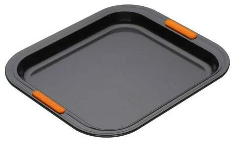 Le Creuset Backblech lösen. Der breite Rand mit Silikoneinsatz sorgt zusätzlich für einen sicheren Tragekomfort.