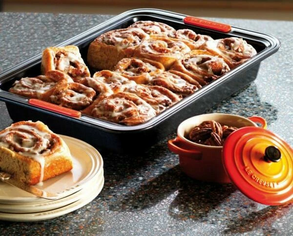 Le Creuset Backform lösen. Der breite Rand mit Silikoneinsatz sorgt zusätzlich für einen sicheren Tragekomfort.