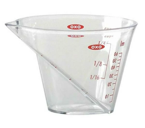 OXO Good Grips abgewinkelter Mini-Messbecher 60 ml. Mit patentierter, schräg nach oben verlaufenden Messskala.