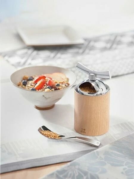 PEUGEOT Leinsamenmühle Isen aus Holz. Sie ist die erste Leinsamenmühle von Peugeot. Diese leistungsstarke Mühle mit speziell entwickeltem Mechanismus zum Mahlen von Leinsamen wird Anhängern einer gesunden, geschmacksreichen Küche begeistern.