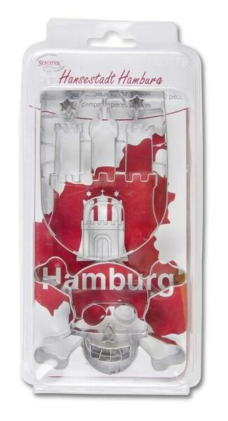 In Sichtverpackung zum Aufhängen. Ausstecher in diesem Set: Hamburger Wappen, Totenkopf