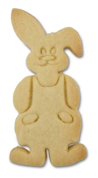 Der Hasenbub steht mit verschränkten Armen, geknicktem Ohr und einem fröhlichen Gesicht da. Dank Vorprägung wird das alles schon beim Ausstechen angelegt.