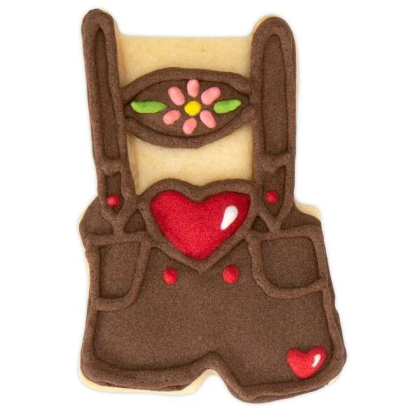 Die typische bayerische Lederhose hat ein Hosentürl, kurze Beine und H-Hosenträger. Unser Trachten-Ausstecher hat all das natürlich auch.