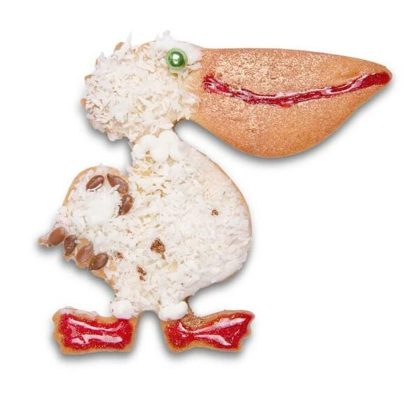 Mit seinem riesigen Schnabel jagt er im Flug Fische: Unseren fröhlichen Pelikan können Sie mit dem Präge-Ausstecher im Handumdrehen nachbacken.