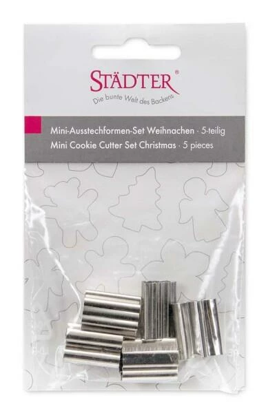 In Sichtverpackung zum Aufhängen. Ausstecher im Set: Engel, Tannenbaum, Lebkuchenmann, Blüte, Bär