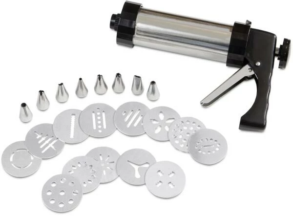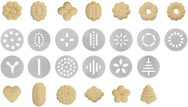 Mit diesem Multitalent bleiben keine Wünsche offen. Ganz einfach und schnell zaubern sie leckeres Spritzgebäck in bis zu 13 verschiedenen Motiven. Zudem können sie mit den 8 Garniertüllen Cupcakes und Torten mit Icing, Frosting oder Buttercreme verzieren.