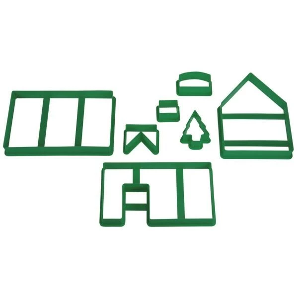 je 1 Ausstecher für das Dach, die Giebelseite, die Seitenwände, den Schornstein und die Tannen, 2 Ausstecher für die Fenster
