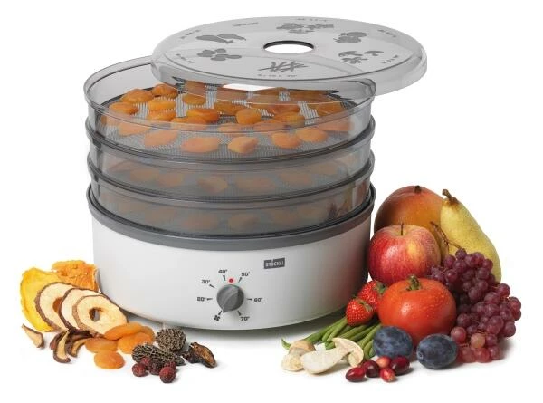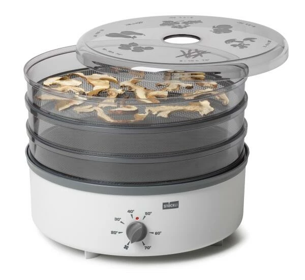 Mit dem Stöckli dörrex Dörrautomat aus pflegefreundlichen Kunststoffgehäuse wird das Trocknen von Früchten, Kräutern und Fleisch zum Kinderspiel! Die verschiedenen Dörrzeiten für das jeweilige Dörrgut sind auf dem transparenten Deckel eingeprägt. Durch die stufenlose Temperaturfeineinstellung und aktive Warmluftzirkulation wird ein perfektes Dörrergebnis garantiert. Die feinmaschigen Metall-Dörrgitter eignen sich u. a. sehr gut zum Trocknen von Kräutern. Insgesamt kann das Gerät mit bis zu 10 Dörrgittern betrieben werden. Inklusive 3 Metall-Dörrgittern und LED-Anzeige, die leuchtet, wenn die Heizung im Betrieb ist.